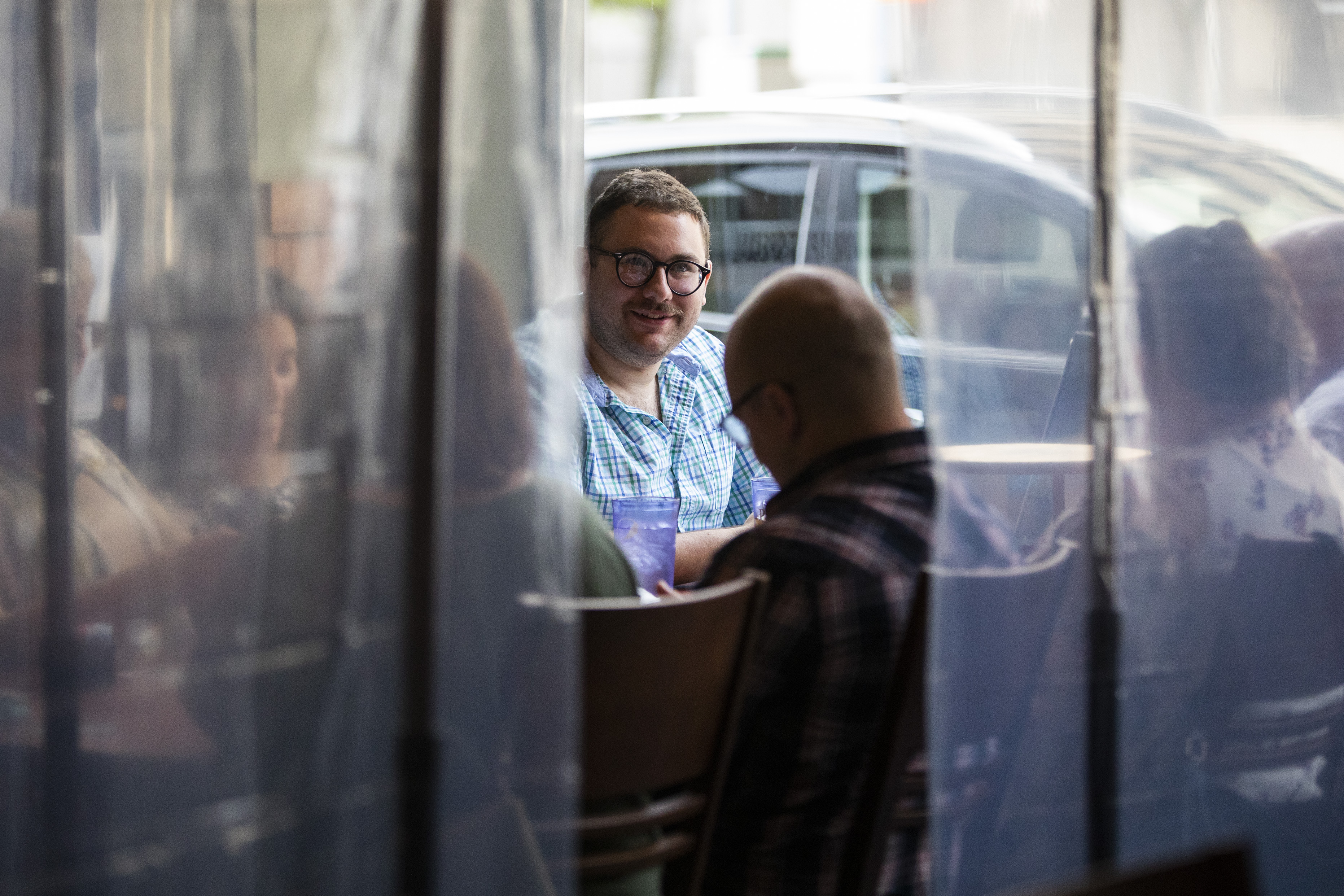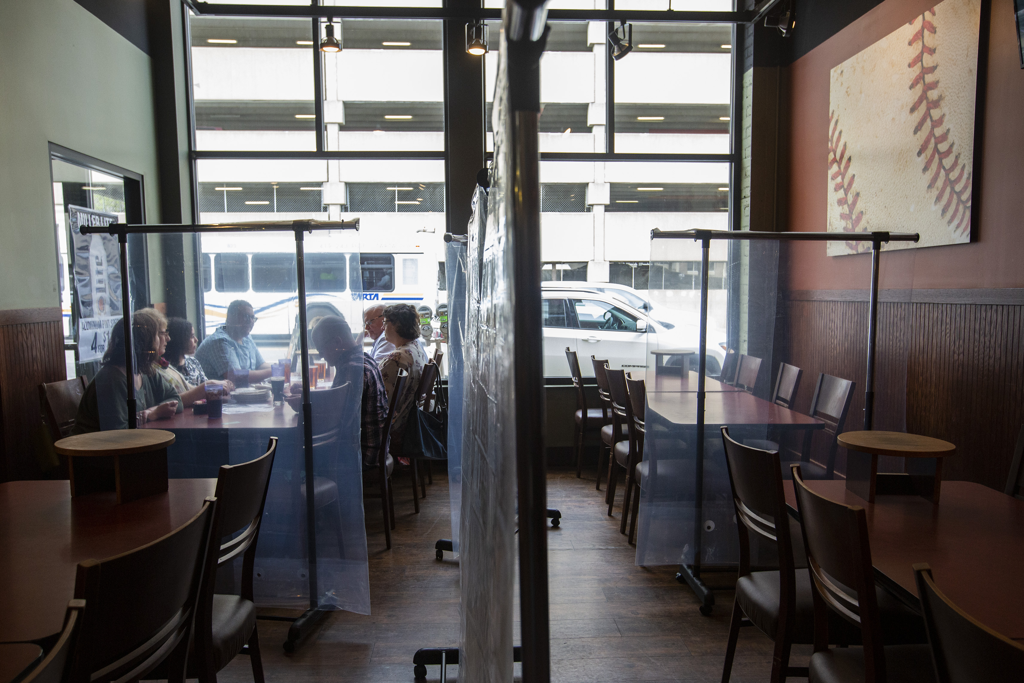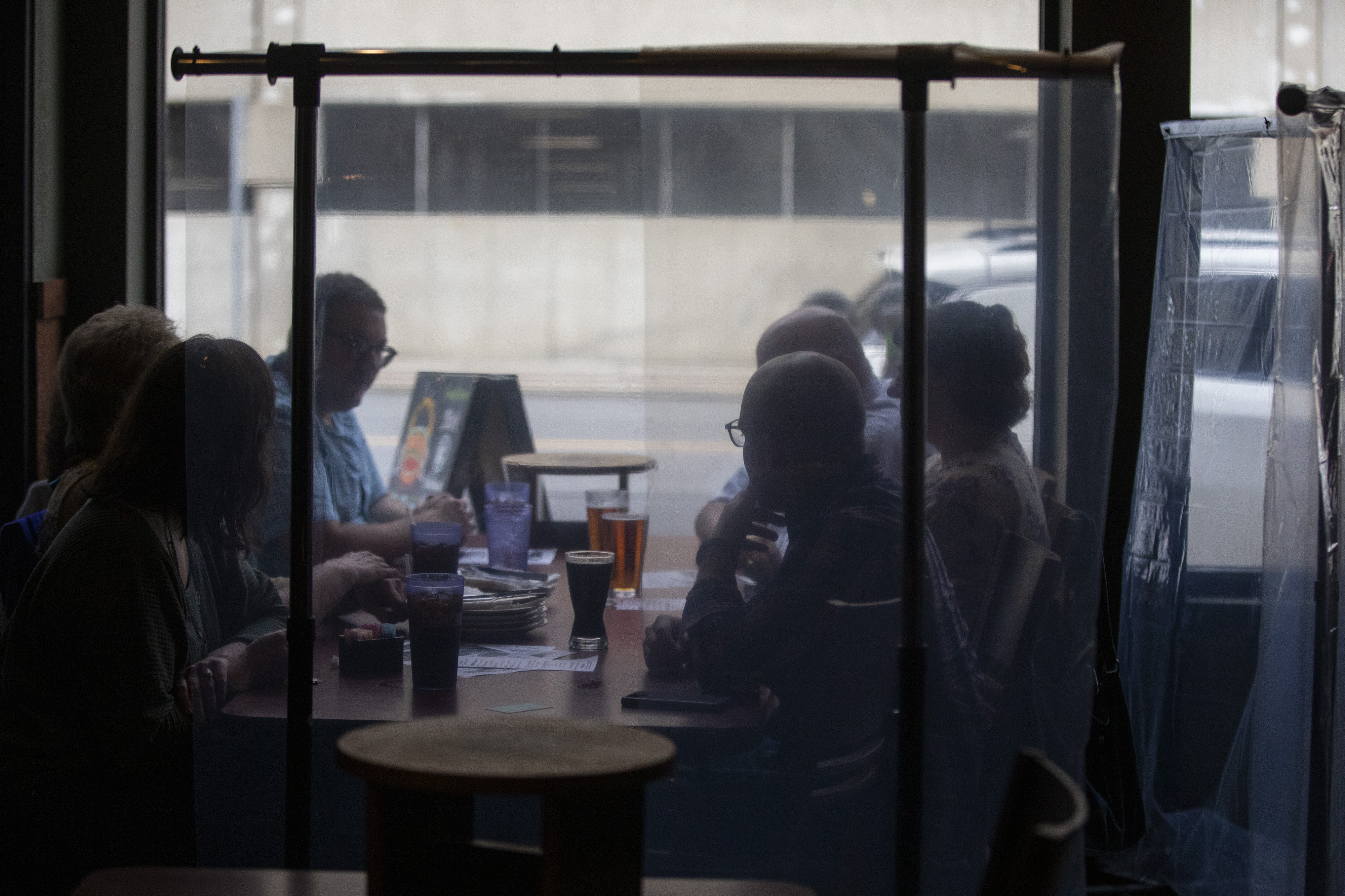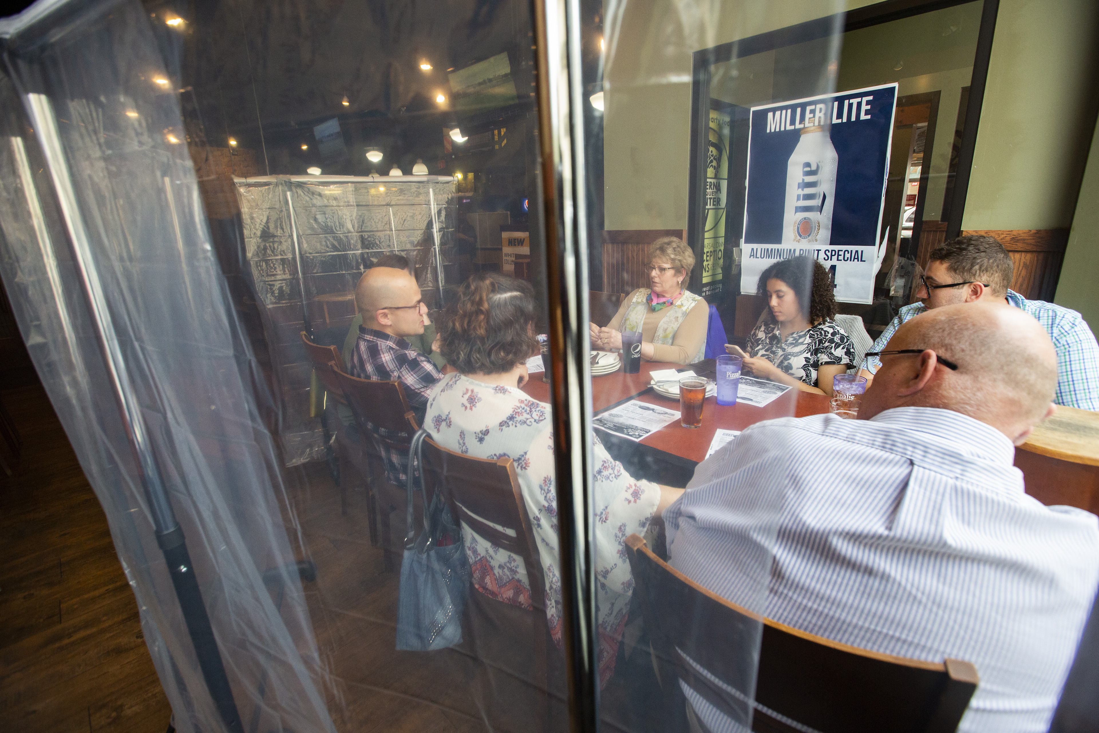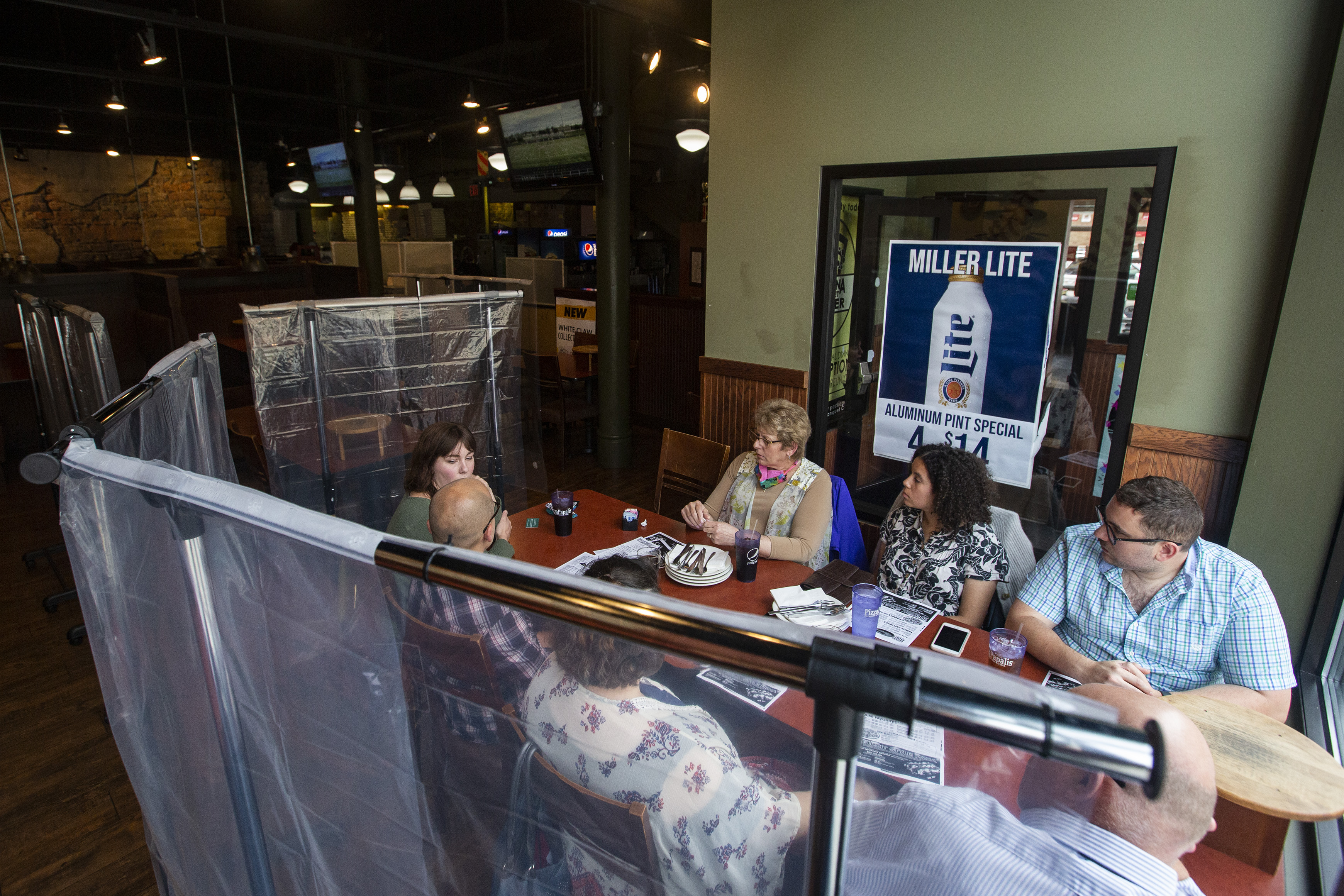 Plastic barriers separate tables as a group of people sit together and talk before ordering at PizzaPapalis in Toledo.