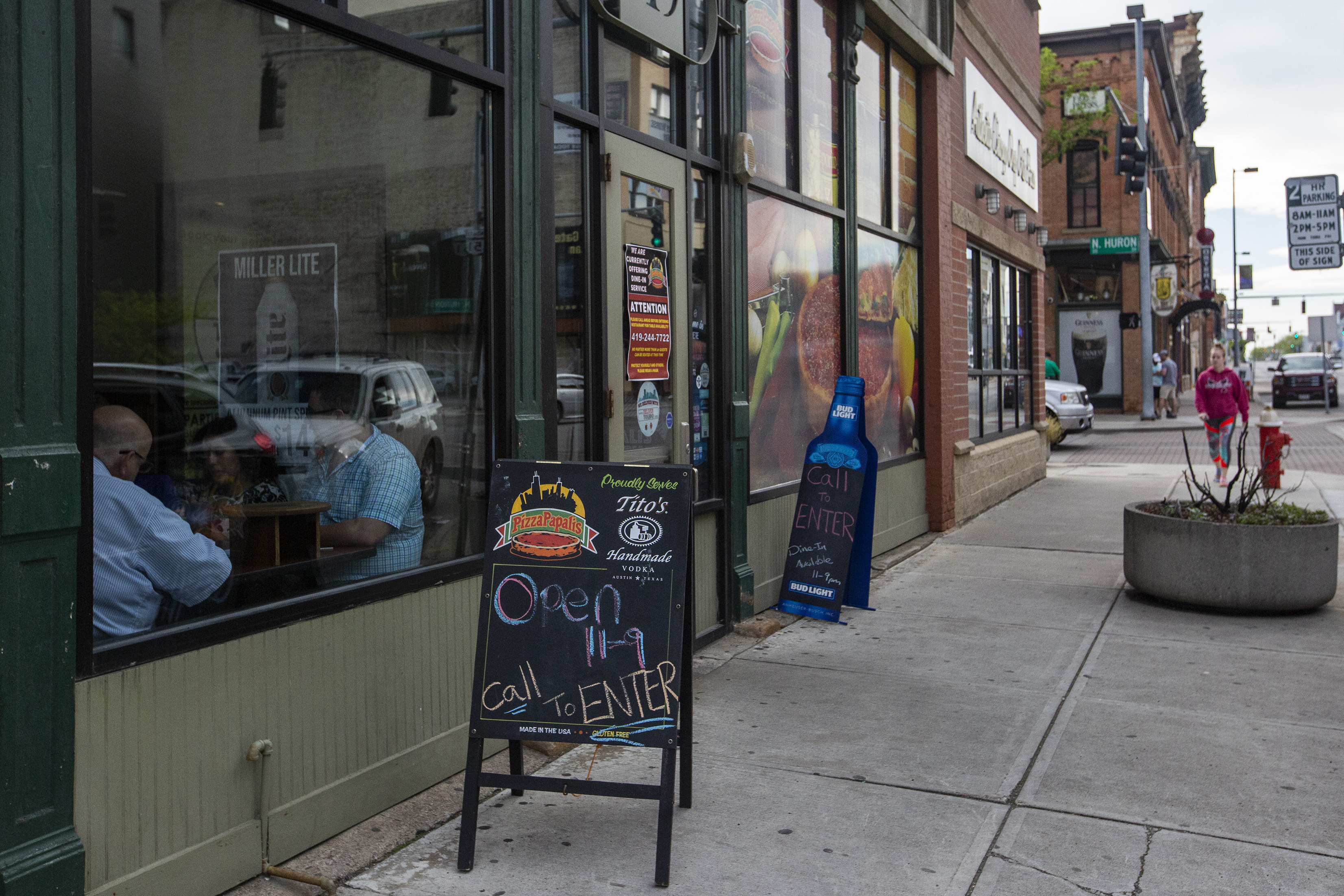 A call to enter sign sits outside of PizzaPapalis in Toledo.