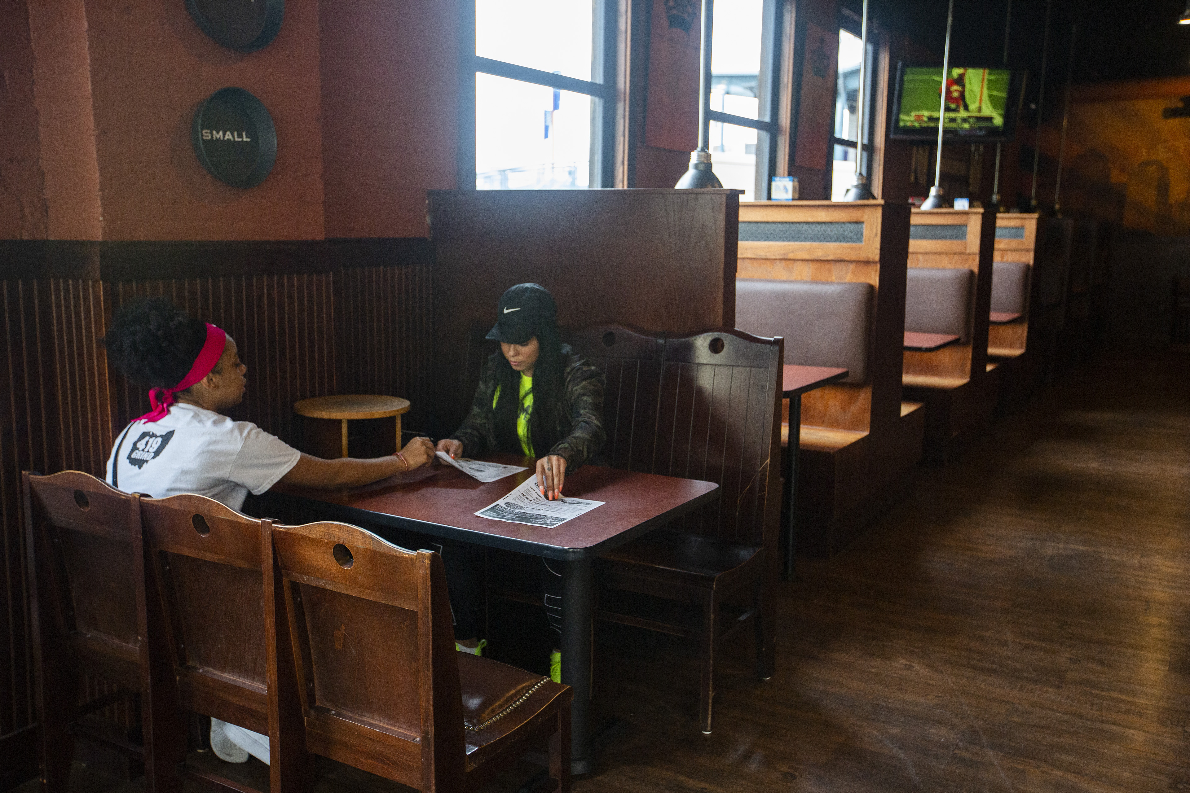Serenity Noles, 12, left, and Samantha Garcia look at the menus at PizzaPapalis in Toledo.